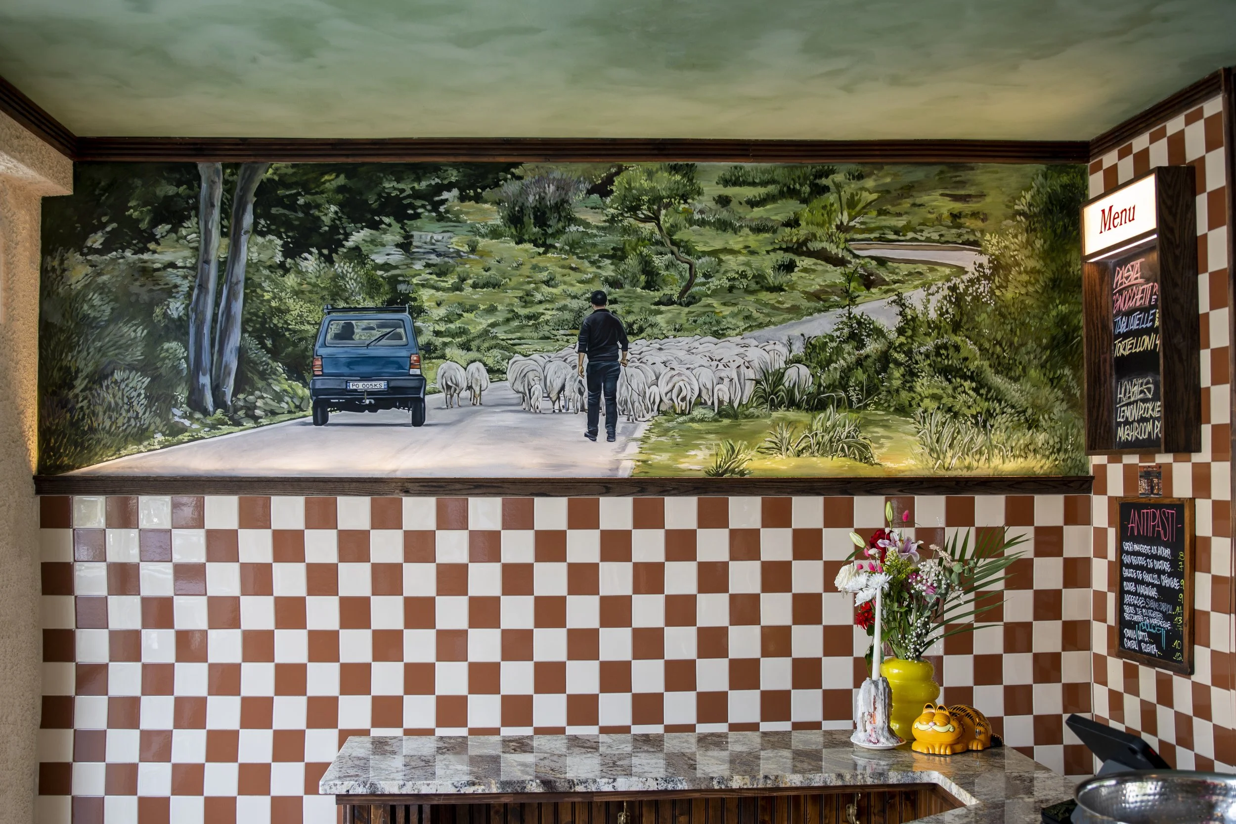 Pasta Pooks is an Italian neo-punk takeout counter tucked away in the heart of Montreal’s Little Italy. The design pays homage to the Italian old country, embracing a rustic and authentic atmosphere. Classic checkerboard tiles, oak wood moldings, and a knockdown plaster finish adorn the walls of this intimate five-seat restaurant. The focal point of the space is two hand-painted frescos created by local artist and longtime friend of Pooks, Dre Wilkin.